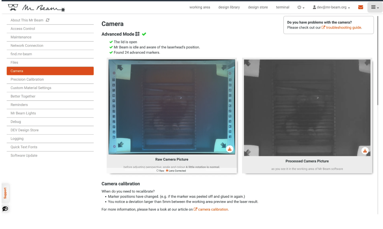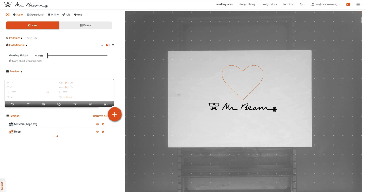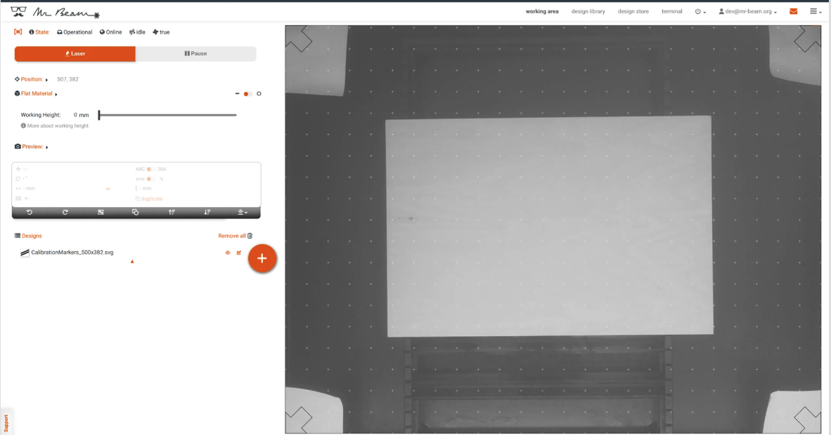 Wenn der Mr Beam eingeschaltet ist und der Deckel geöffnet ist, sollte ein Schwarz-Weiß-Bild des Arbeitsbereichs angezeigt werden. Dieses Bild eignet sich zur Positionierung, jedoch ist eine Abweichung von bis zu ±5 mm normal.