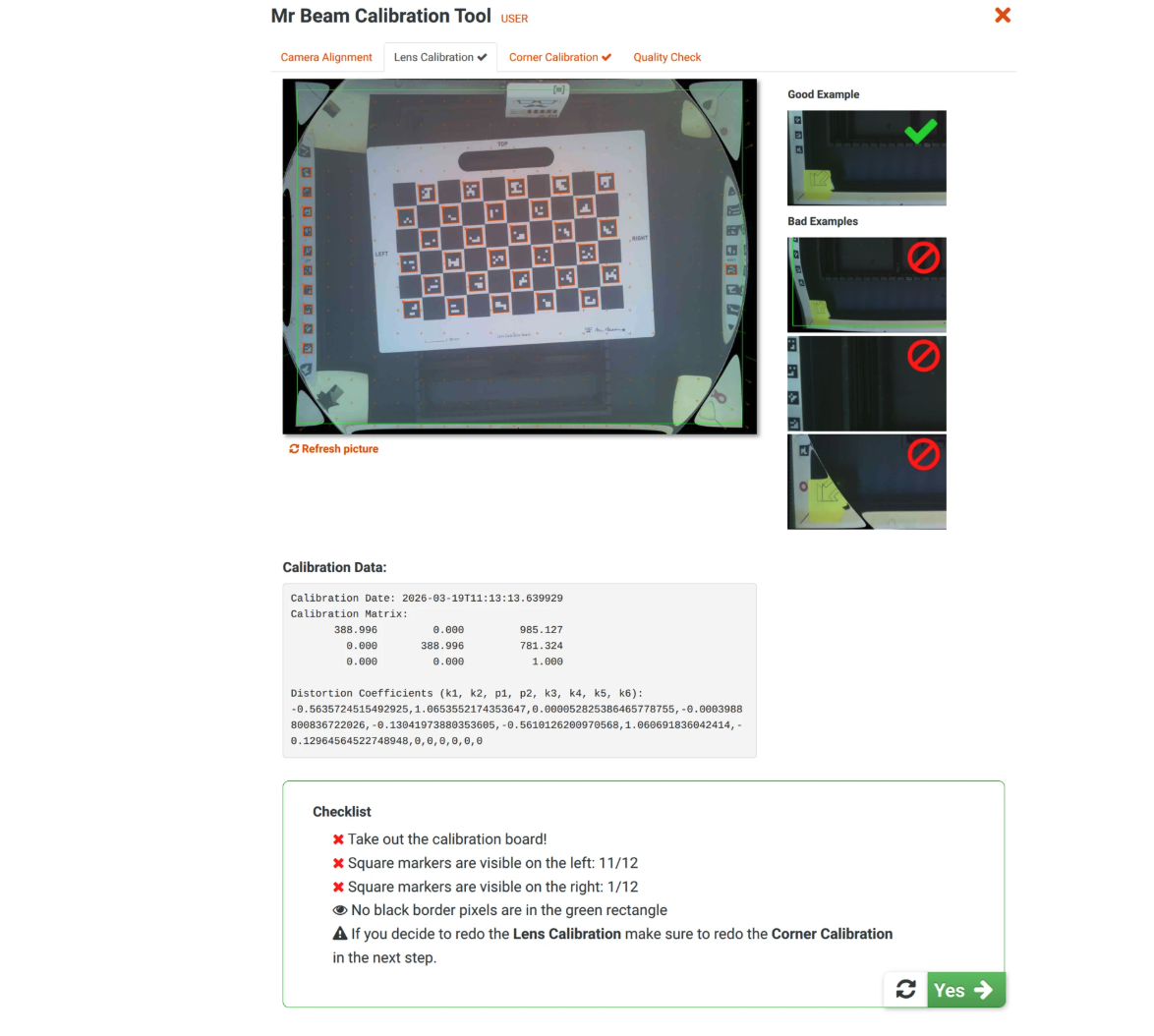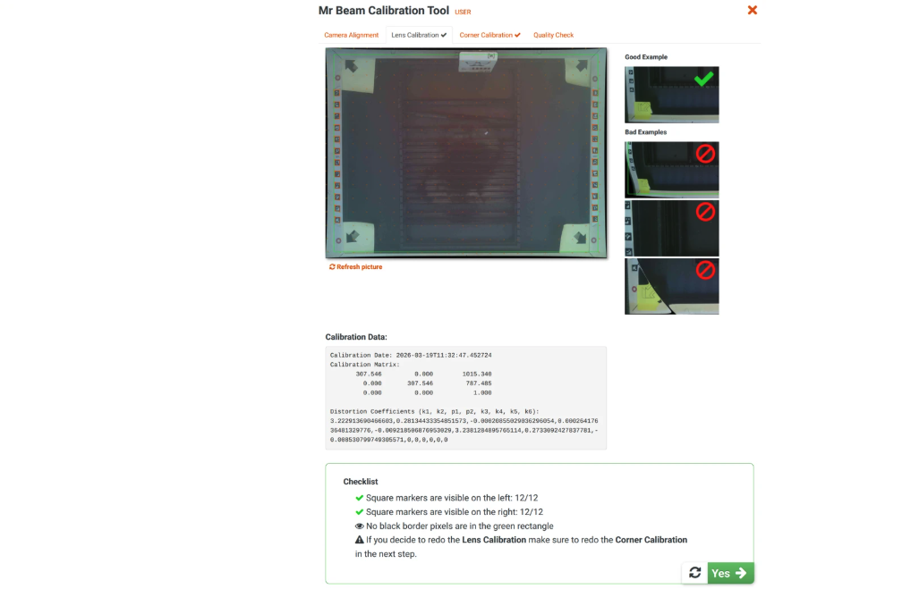 Wichtig: Prüfe auf Fischaugen-Verzerrung. Falls sichtbar, klicke auf Redo und wiederhole die Kalibrierung.