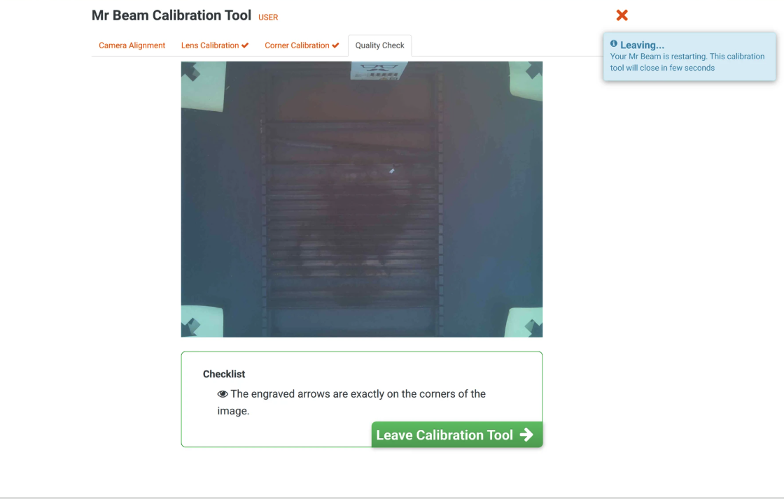- Wenn alles korrekt ist, verlasse das Kalibrierungstool